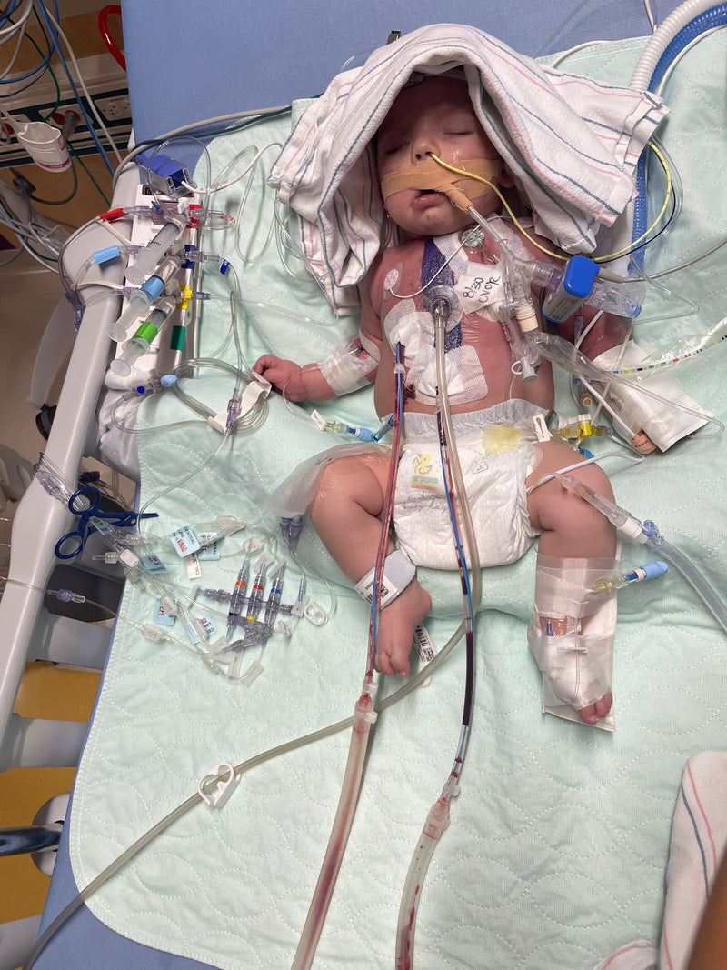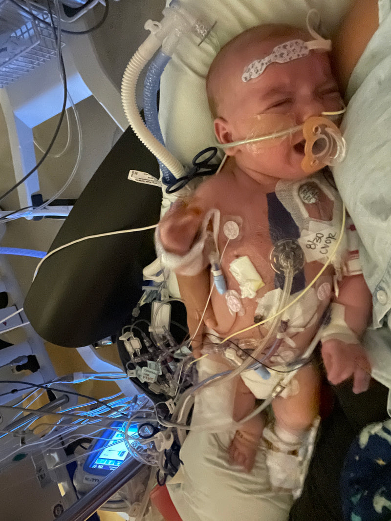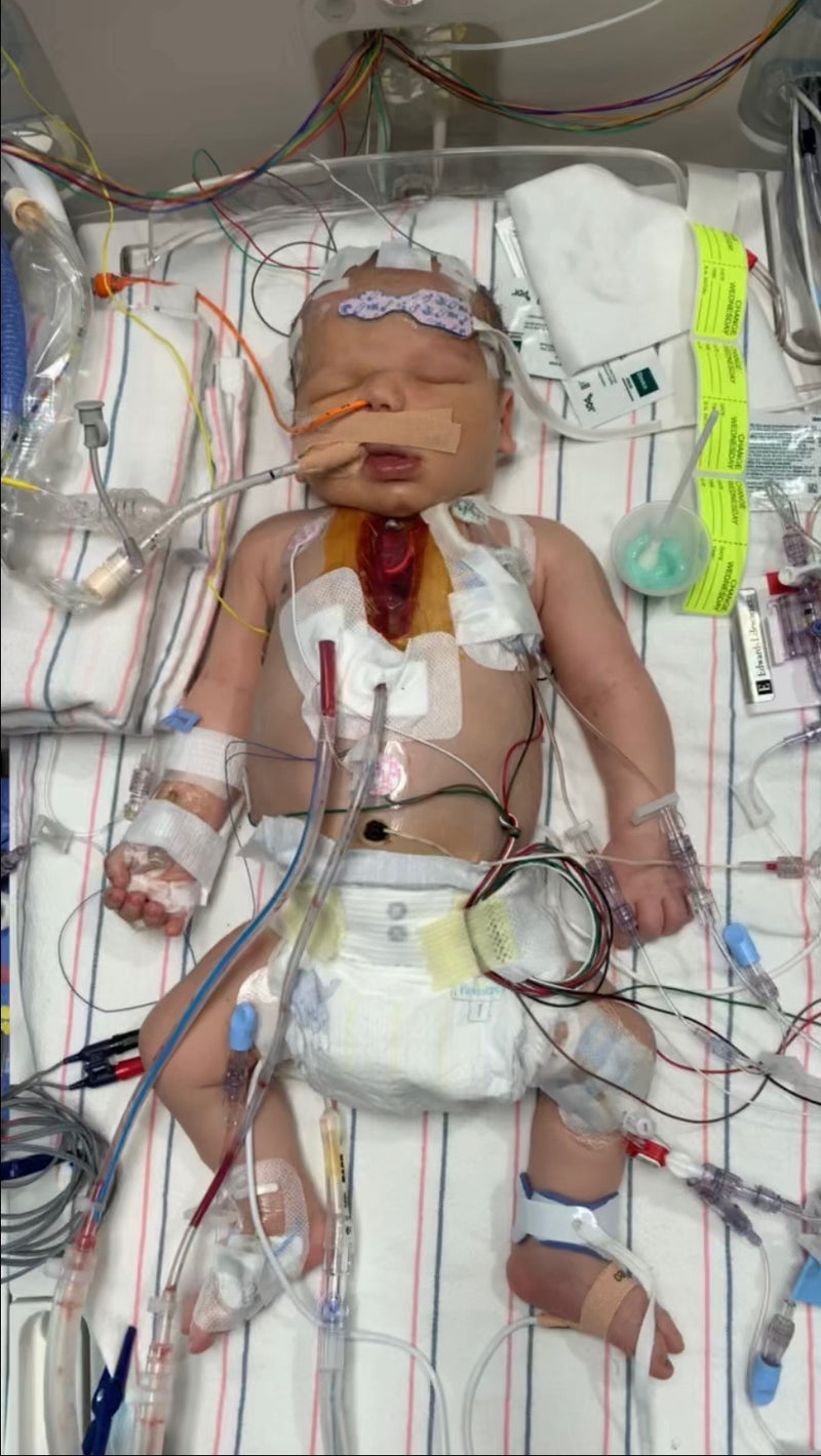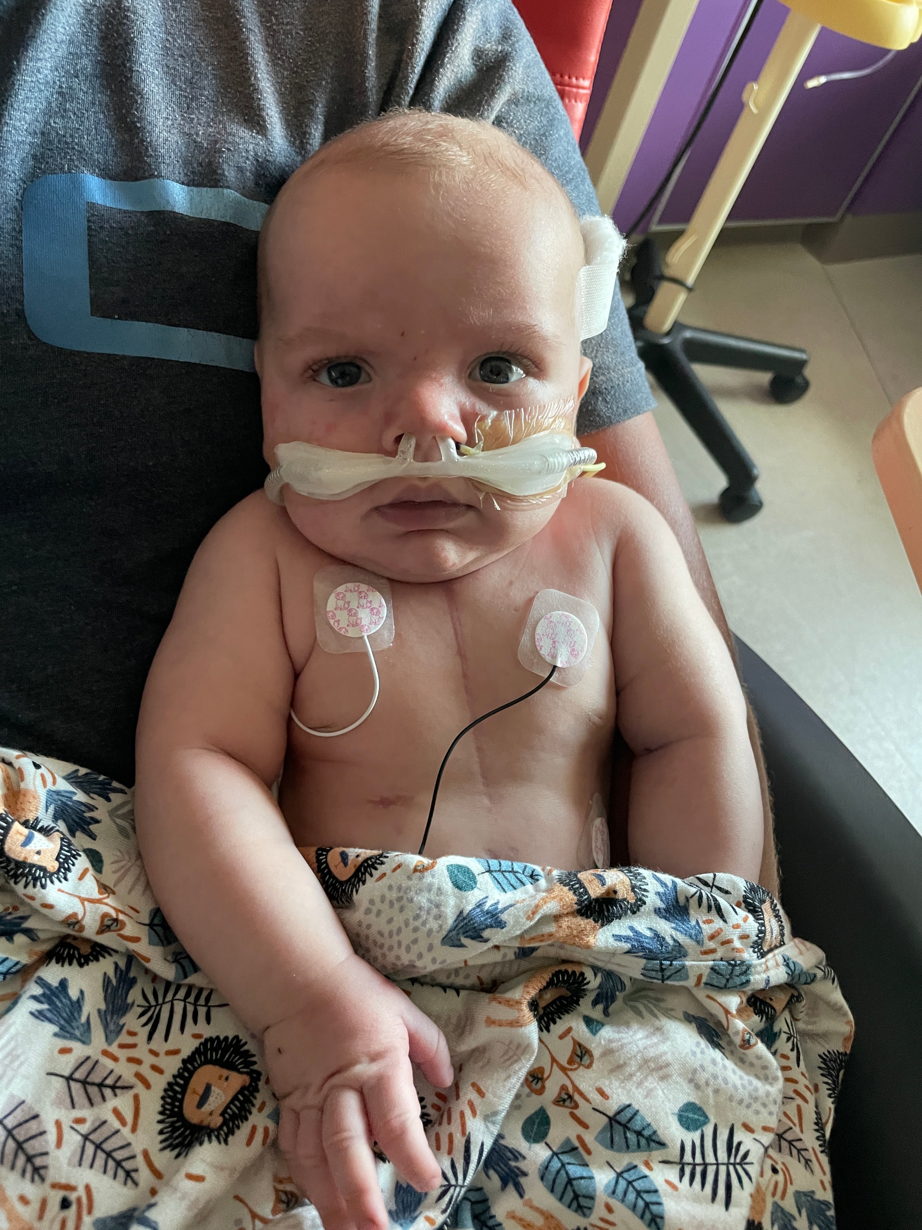 On Ryder’s sixth day of life, he underwent his first open-heart surgery—the Norwood Procedure—earning his first zipper scar. Recovery was incredibly difficult. His chest couldn’t be closed for nearly a week due to swelling, and we could see his tiny heart beating. There were moments we nearly lost him, and many more over the next two months that left us terrified. Even now, we still cry thinking about that time.