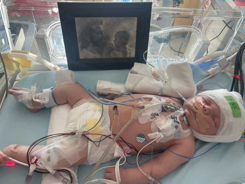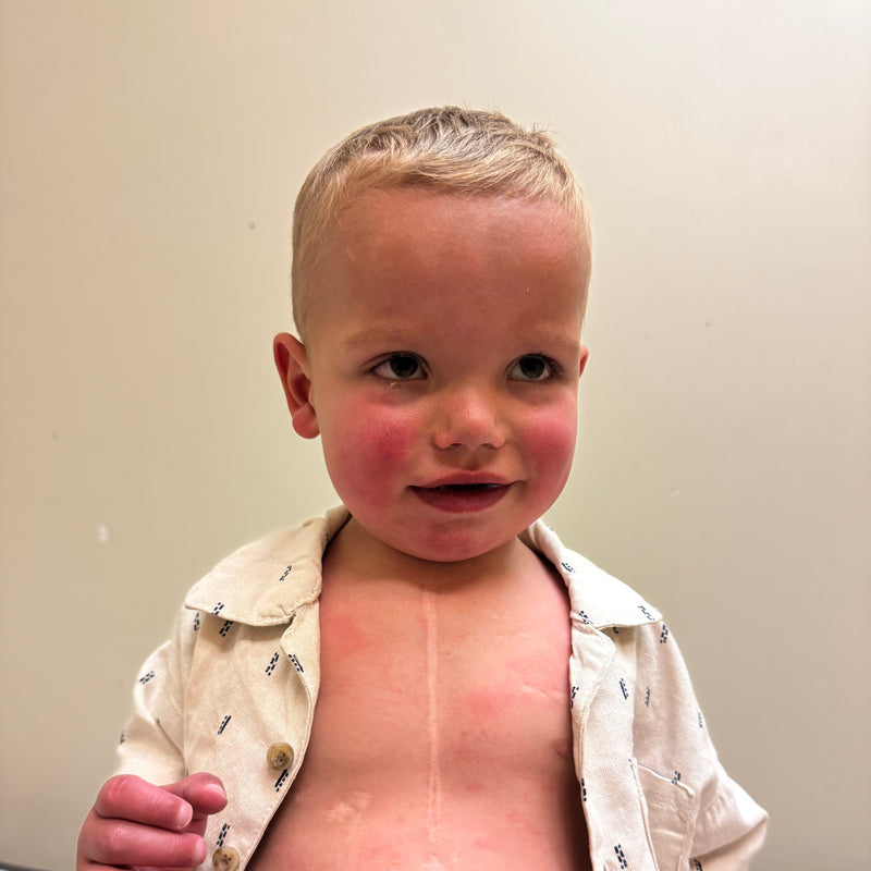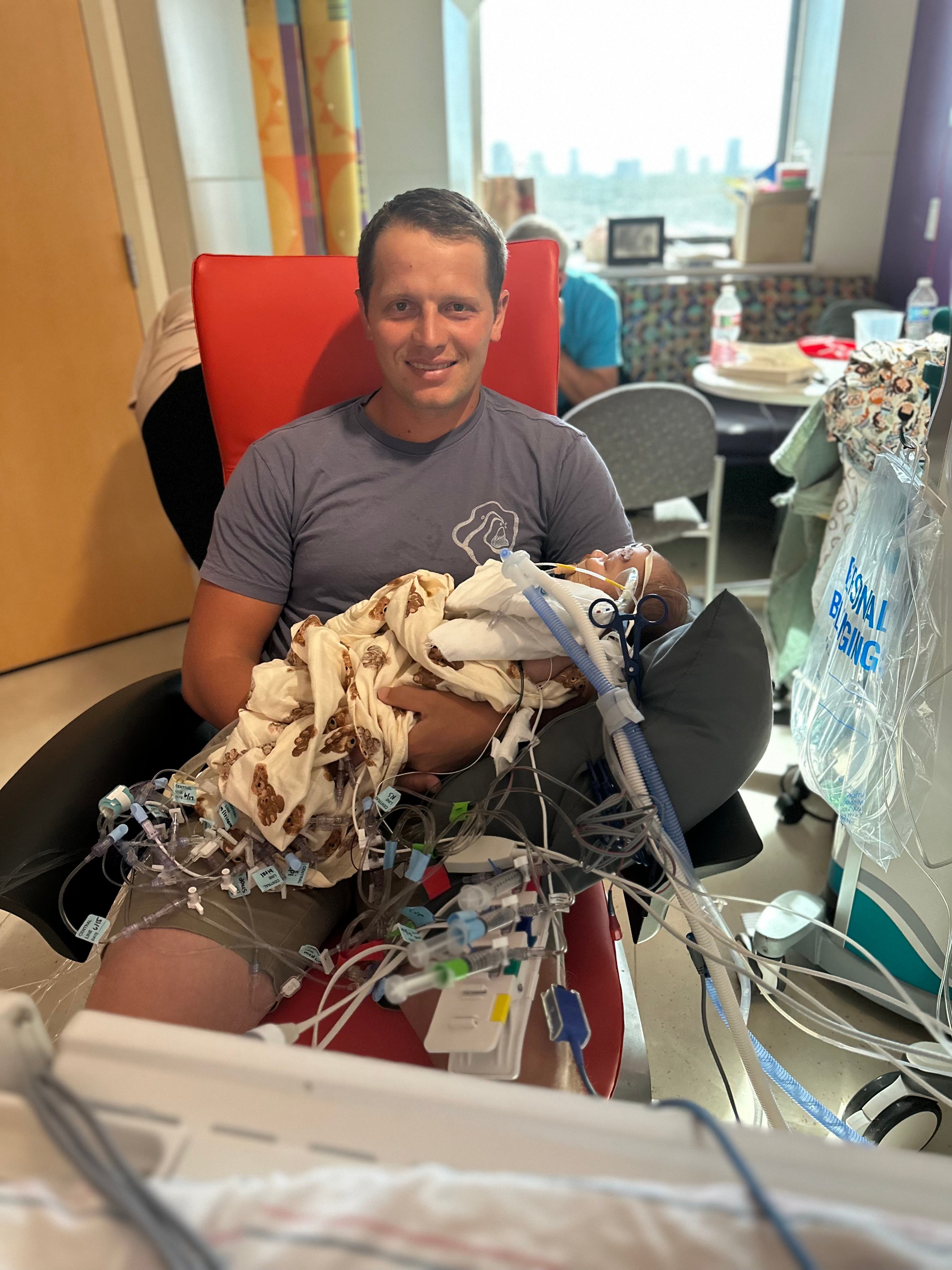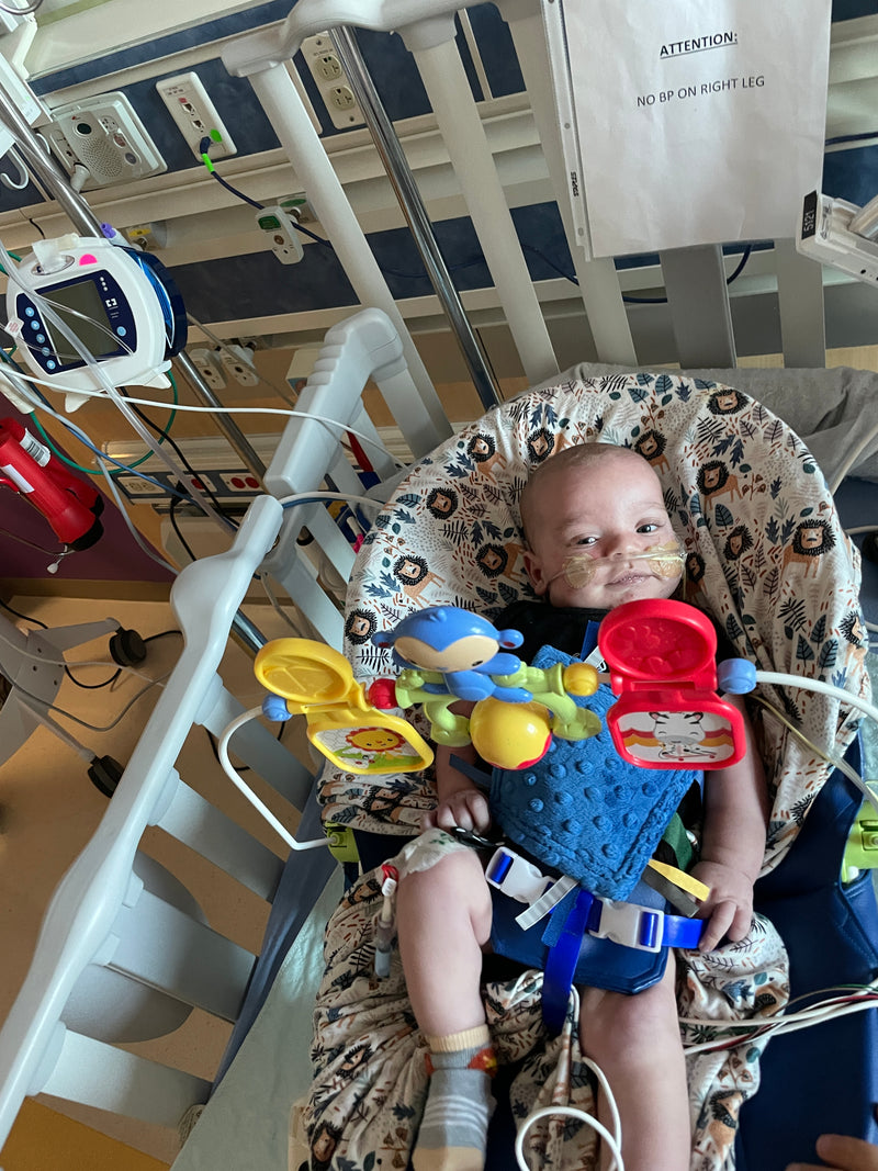 On Ryder’s sixth day of life, he underwent his first open-heart surgery—the Norwood Procedure—earning his first zipper scar. Recovery was incredibly difficult. His chest couldn’t be closed for nearly a week due to swelling, and we could see his tiny heart beating. There were moments we nearly lost him, and many more over the next two months that left us terrified. Even now, we still cry thinking about that time.